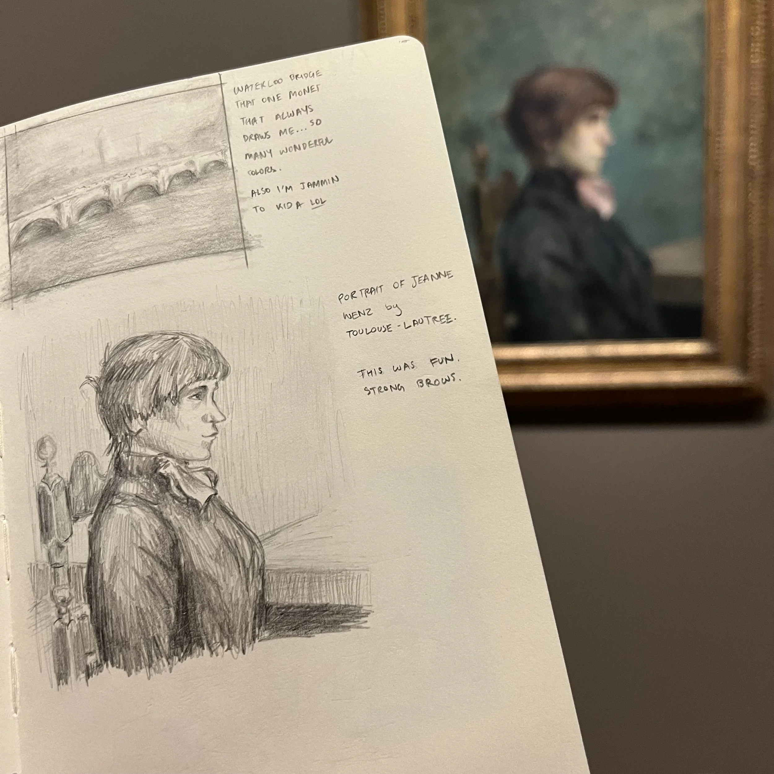 The next thing that caught my eye was this portrait of Jeanne Wenz by Toulouse-Lautrec. Something about her gaze, profile, and posture. I spent a LOT of time here. Maybe something close to an hour and predominantly on her face. I really wanted to achieve likeness, which I think I did! Her clothing and surroundings were really just an afterthought that I should fill those things in. I enjoyed drawing this. But standing, holding, and sketching for so long… my body did not enjoy.