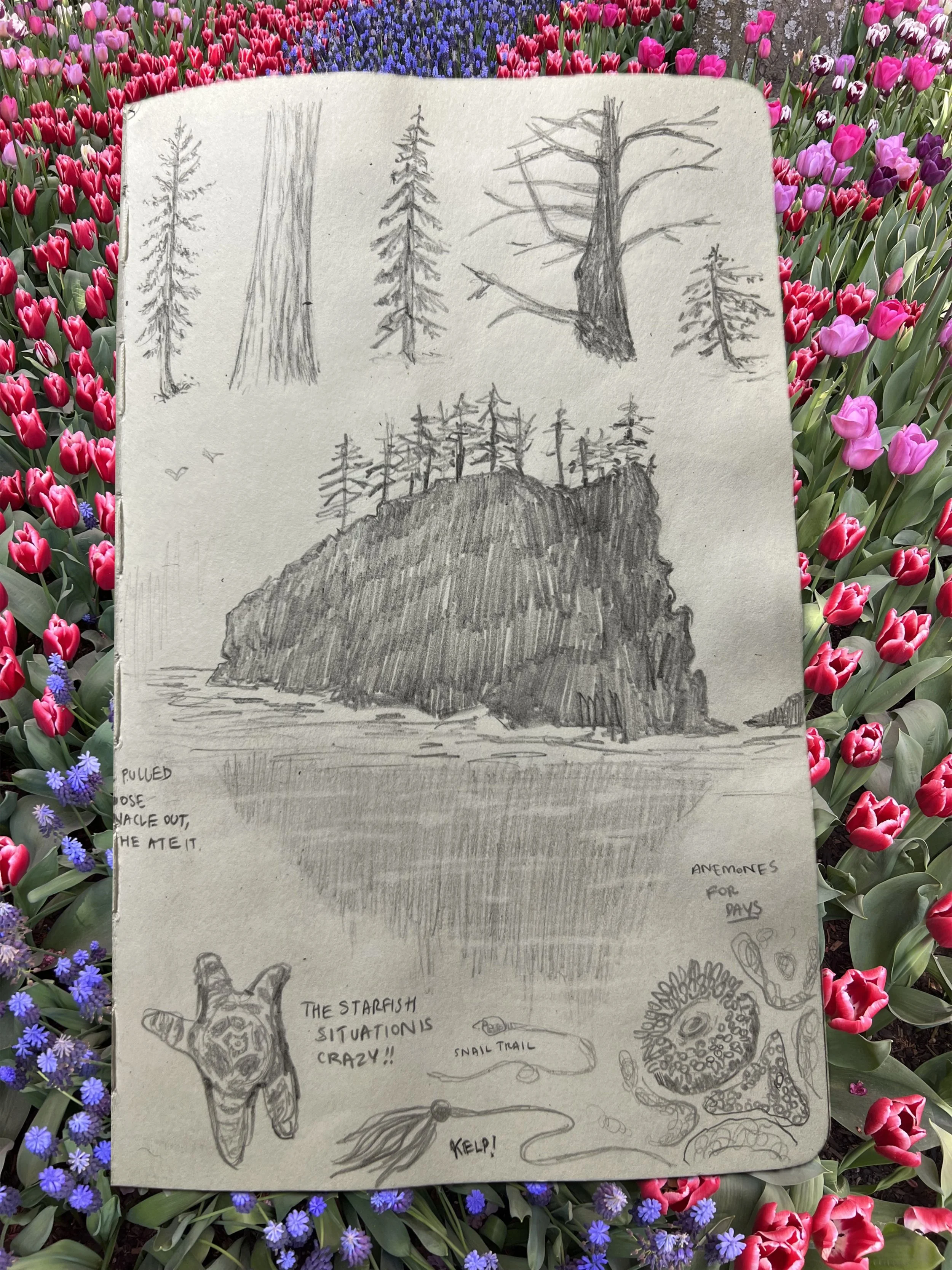I drew most of this after our trip. Some day I hope to go back and sit there to draw every observation. We touched everything. The starfish were strong. The anemone were sticky and a little numbing, the barnacle insides were disgusting.