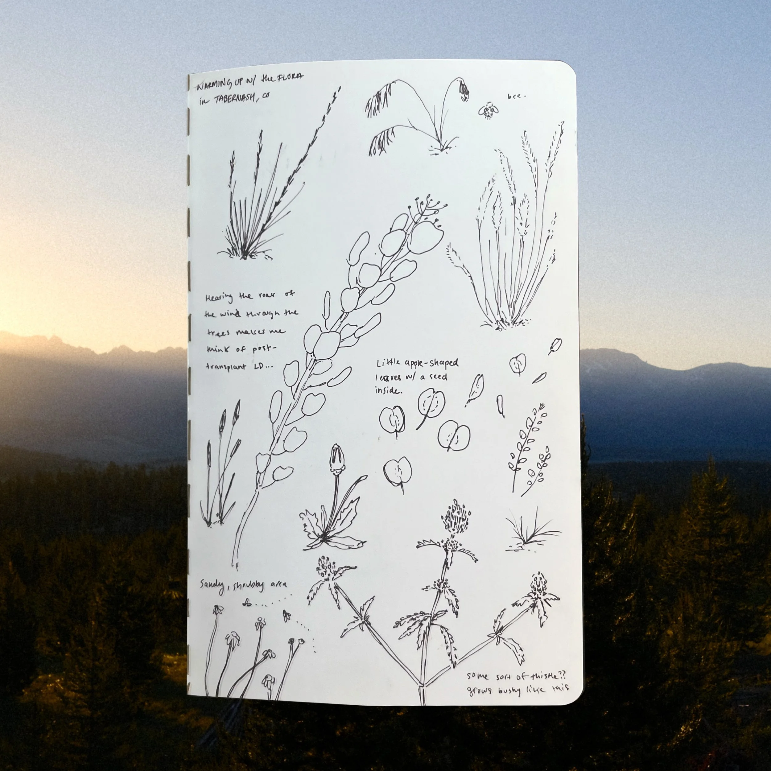 We stayed out in a remote area near Winter Park. Because it was June, the flora was teeming with life. Tons of wildflowers and grasses. I sketched this one morning. I loved the shapes of the field pennycress so much I painted it on the next page: